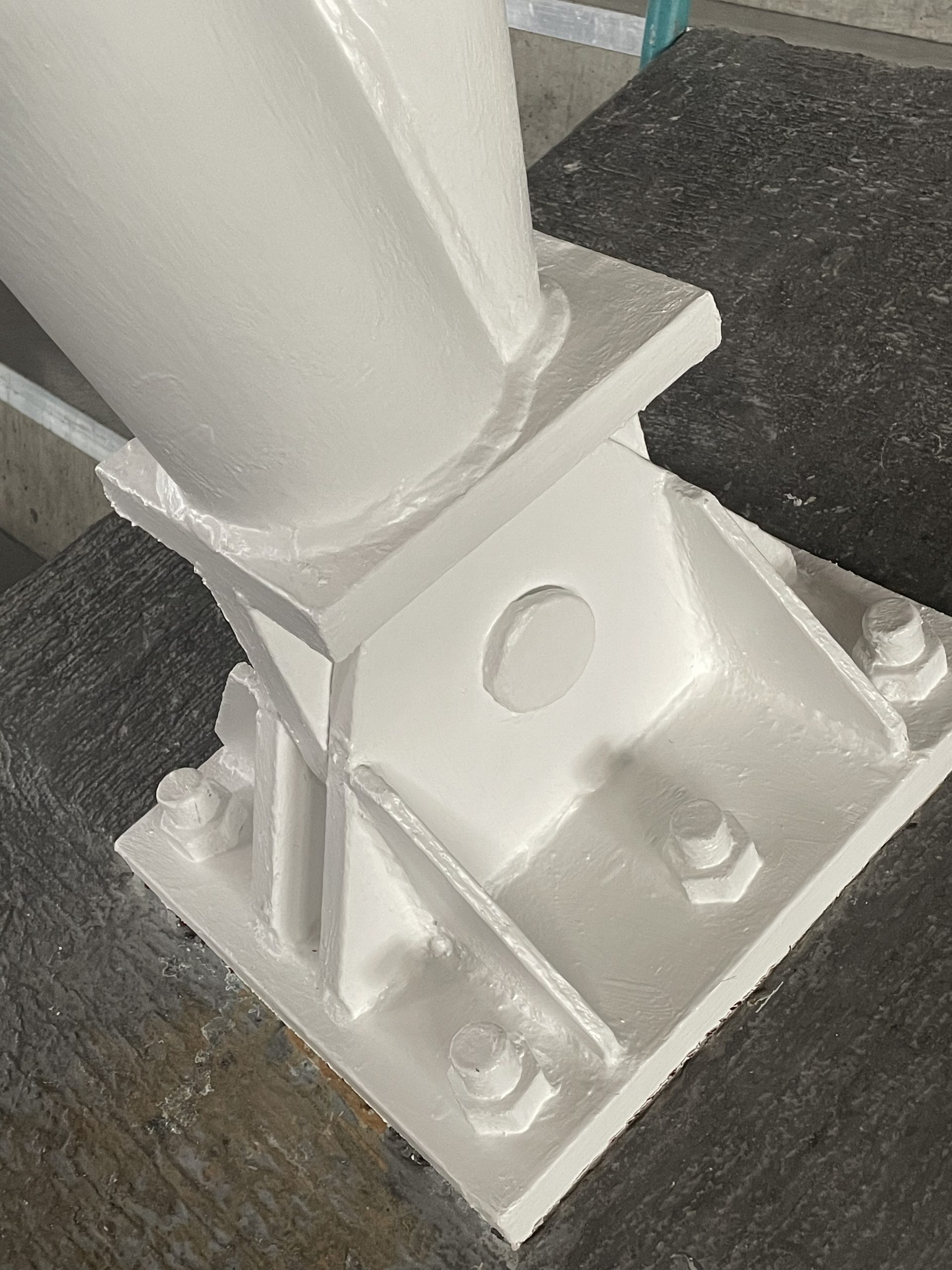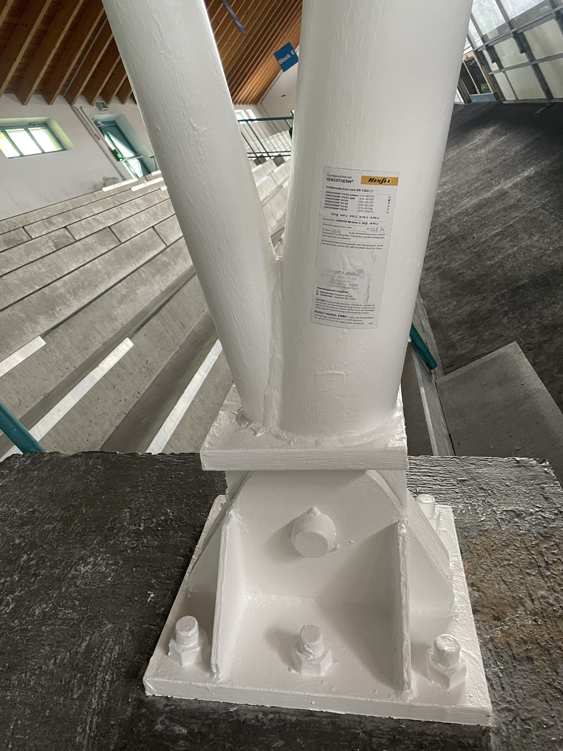 Alte Brandschutzbeschichtung an den Stahlsäulen durch Abbeizen entfernt und neue Brandschutzbeschichtung in mehreren Arbeitsgängen aufgetragen.